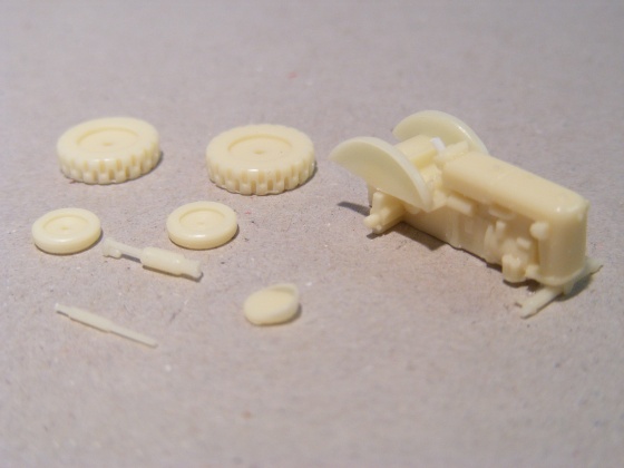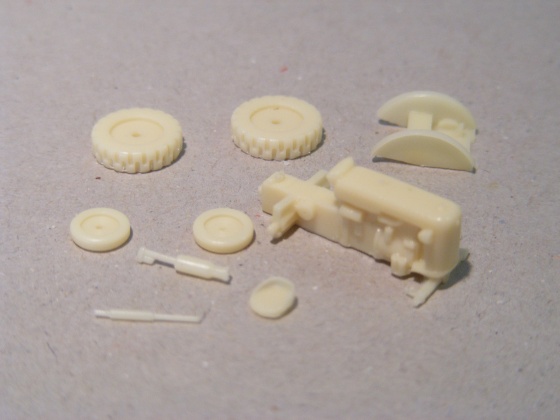 Odlitek i lepty vypadají skvěle, proto se divím, že mřížka chladiče je jen obtisk. Na dodělání mřížky do odlitku rytím jsem levej a navíc se mi moc klepou pazoury. Jestli tu potvoru pořídím a budu stavět, tak disky všech kol (nejen zadních) natřu zvlášť a dolepim je až po dokončení nátěru modelu.