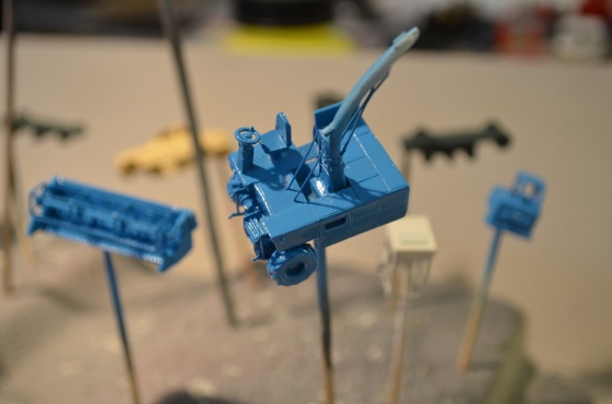 Takže polotovary jsou připravené, mohlo vše do „lakovny“. Nejprve základovka. Potom modrá na stroj a na lištu. Kabina a výfuková roura bílá, kola černá a disky červené.