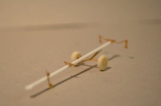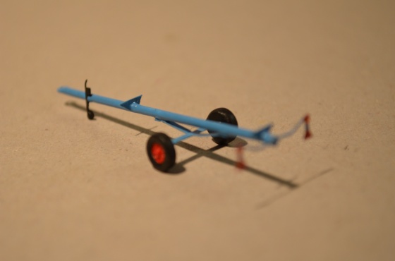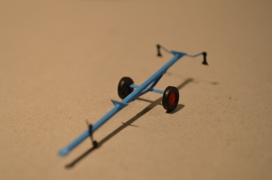 Sestavení vozíku je velmi jednoduché. Na páteř se osadí náprava z leptu s kolečky, zadní čelo se světly, podpěry pro lištu a opěrné kolečko pro samostatné stání vozíku.