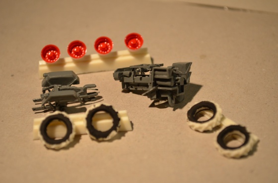 Obě části pojezdu jsem natřel šedou Revell SM 378, dále disky kol červenou č. 34 a pneumatiky černou SM 8.