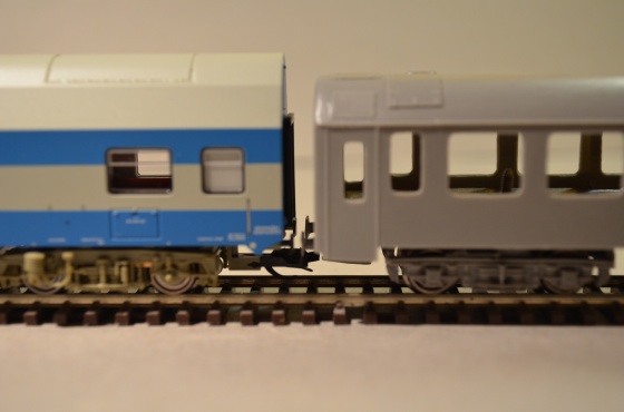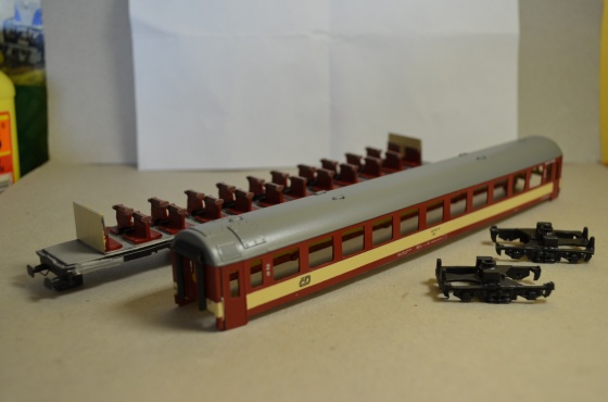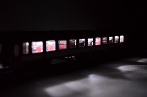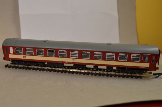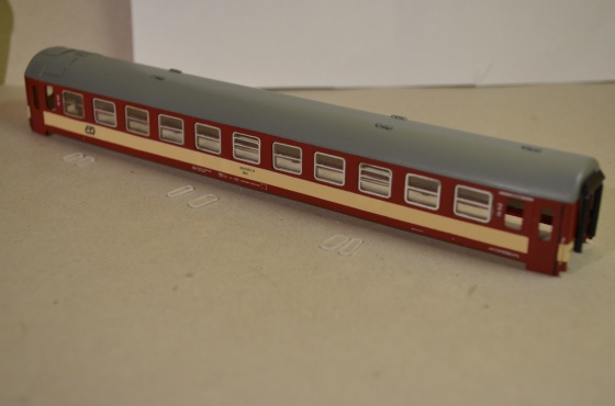 Tyhle vozy jsou zatím takovým mým „nesplněným snem“ spolu s 854 a 954, takže jako inspirace super. Co bych tomu osobně vytknul, tak střecha by měla být šedohnědá, nikoliv šedá. Stejně tak celý pojezd je stříkán šedohnědou (zdá se to jako blbost, ale i na obyčejné 010 to hooodně změní vzhled modelu, než když je to nechané v černé barvě plastu – zároveň ten odstín šedohnědé je ve výsledku hodně jiný od obyčejné šedé). Že jsou podvozky v reálu spíše do černa je součástí patiny. U těch obtisků si nejsem jistý tím služebním oddílem (jeslti ho vozy vůbec mají?), každopádně když už, tak služební oddíl by měl mít myslím neprůhledné sklo (snad nějaký znalec mě doplní a opraví). Já osobně budu chtít určitě nějak pořešit „kouřová“ skla jako odlišení od těch „obyčejných“ na rychlíkáčích, na to je snad nějaký transparentní lak od Agamy. Osvětlení se mi moc líbí, jen jsem toho názoru, že „vypínat“ některé zářivky ve velkoprostorovém oddílu není v našem měřítku moc použitelné, aniž by to nevypadalo blbě… Jinak moc oceňuju, že je tu taky něco jiného než jen povrchová úprava, tohle je super inspirace pro lidi, kteří by zrovna to osvětlení rádi zkusili, takže díky za to 🙂