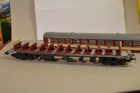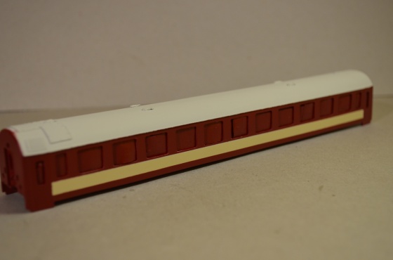 Skříň dostala nástřik nejprve pruhu světle hnědé barvy SM 314, vlastně i stěn interiéru, pak červenou Revell SM 331 a nakonec šedou SM 374 na střechu.