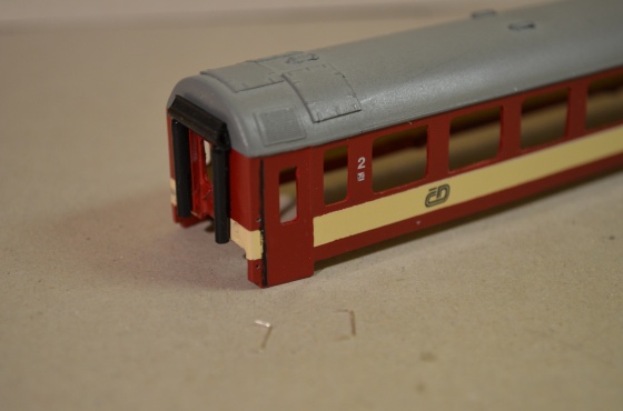 Čelníky jsem pod nárazníky ještě doplnil o madla, která jsou vyrobena z drátku a usazena do předvrtaných otvorů.