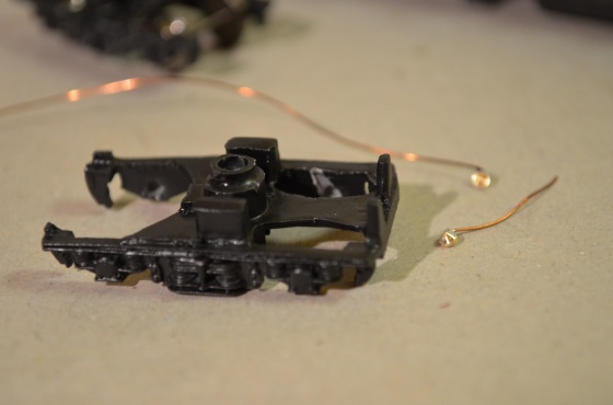 Ložiska jsou mosazná, takže se na ně dá velmi dobře naletovat drátek, který pak stačí přilepit a vyvést k dosedacím plochám podvozku, kde jsem pak vyrobil z měděného plechu sběrače, z nichž jsem vyvedl kablíky přímo k elektronice osvětlení.