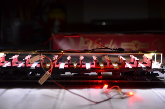 Jak se ti prosímtě osvědčuje přívod proudu přes ty kontaktní plíšky? Já jsem raději volil variantu obdobnou BTTB, tedy každý podvozek sbírá přes ložiska proud z jedné koleje a šroubem – čepem je spojen do interiéru. Ale tady ti to vzhledem k těm kondenzátorům vydrží svítit chvíli i „ve vzduchu“, tipuju.