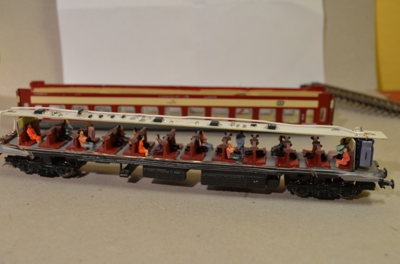 Šedohnědá na střeše? Mě to v reálu spíš připadalo, jako provozem „do zrzava“ olezlá šedá. Asi bych zkusil namíchat práškové patinátory prach, světlá rez a hlína (možná i trochu „klasické“ rzi) a pak je za sucha opatrně nanesl na střechu dle reálné předlohy. Na fotkách je model vozu, kterej zrovna vyjel z dílen (čímž ho nehaním, vypadá jako živej).