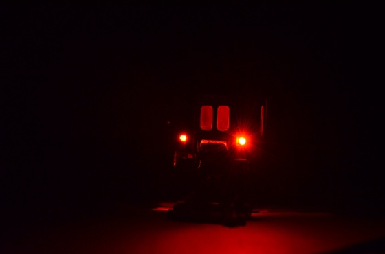 Vůz sesazený a postavený na programovací koleji připravený ke zkouškám osvětlení.