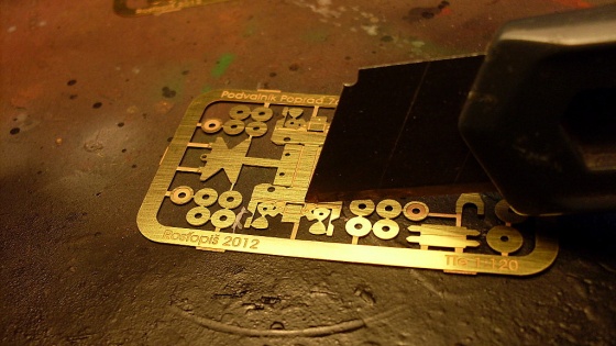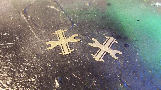 Dalším krokem je ohnutí boků podvozků k třetí vrstvě podle protažené drážky. Ještě připomenu, že pro stavbu leptů nepoužívám žádné speciální vybavení, většinou ohýbám pinzetou a v rukou. Občas si pomůžu šuplerou, ve které díly svírám když potřebuju ohnout delší nebo špatně uchopitelný díl. Funguje tak jako taková improvizovaná ohýbačka.