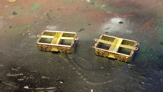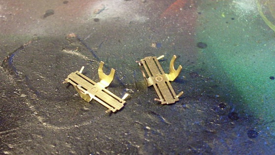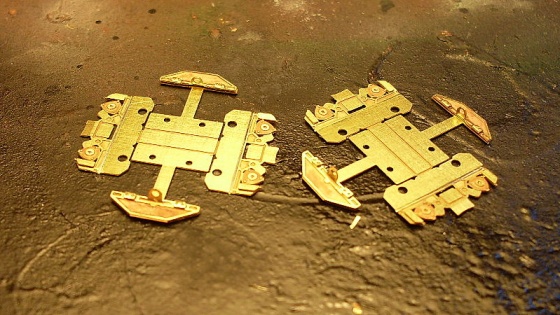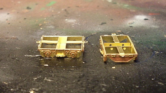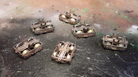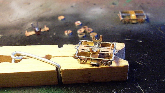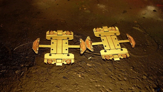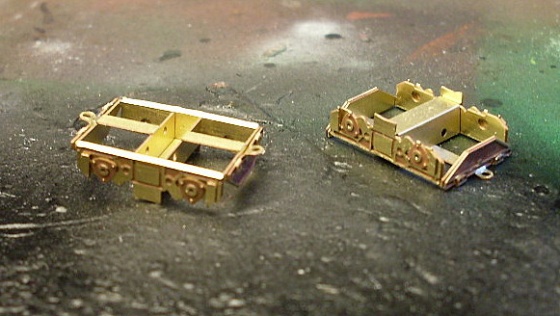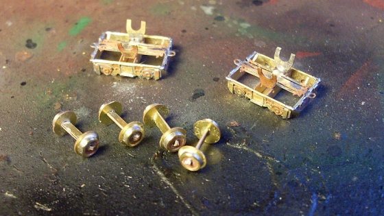 Místy jsem se dostal na hranu vyrobitelnosti, naštěstí na leptu je všechno co tam být mělo. Plíšek obsahuje díly na složení kompletního jednoho podvalníku včetně dvojkolí. Tento rozměr jsem zatím totiž nikde nenašel a tak jsem musel vymyslet vlastní. Model jsem se snažil navrhnout tak, aby i za cenu složitějšího ohýbání byl z co nejmenšího počtu dílů (dá se to totiž pak spájet jedním vrzem a nehrozí, že se vám něco někde pohne, když je to jeden díl). Vzhledem k tomu, že celkové rozměry podvalníků jsou osekané provozními potřebami, určitě vás nepřekvapí fakt, že neodpovídá ani rozvor. Kolečka totiž musí mít nějaké okolky a jinak se prostě nevešly. I přes všechny kompromisy a fakt, že celý model vznikl od oka (výkresy jsem žádné nenašel a měřit se mi nechtělo) podle pár skicek si ale myslím že se to nakonec celkem povedlo.