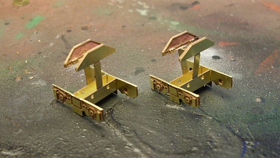 Hodí se pro začátek ohnout ložiska a kryty vypružení na bocích tak, aby lícovaly s reliéfem na podkladové vrstvě. Dalším ohybem o 180° přehneme imitace gumových nárazníků na čelech (někdy je drážku taky nutné protáhnout). Potom je na čelnících tažné oko. To jsem si ale vymyslel, na skutečné předloze je trochu jinde a mnohem menší, takže kdo ho nechce, odstřihne ho. Oko se ohýbá jenom o 90°. Potom se celá deska čelníku připlácne k druhé vrstvě (všechny ohyby jsou zatím drážkou ven).