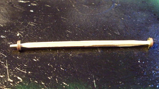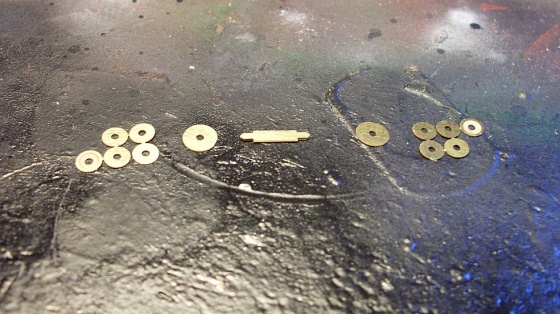 Následuje montáž dvojkolí. Dostal jsem nápad použít vteřiňák, který je dokonalý izolant, takže okolky i kolečka k hřídelce lepím. Po vytvrdnutí je spoj dostatečně pevný. Pochybuju ale, že je izolace opravdu spolehlivá a lepidlo zateklo všude. Nemám zatím kde vozíčky projet abych to ověřil, možná bude potřeba pojezdovou plochu kol natřít nějakým lakem, ideálně se budu snažit zajistit výrobu koleček z nějakého plastu, což by také usnadnilo sestavování. Zatím ale postupuju tak, že navleču okolek, kápnu lepidlo a nasunu kolečko. To samé i na druhém konci osičky a kolečka co nejlépe vycentruju.