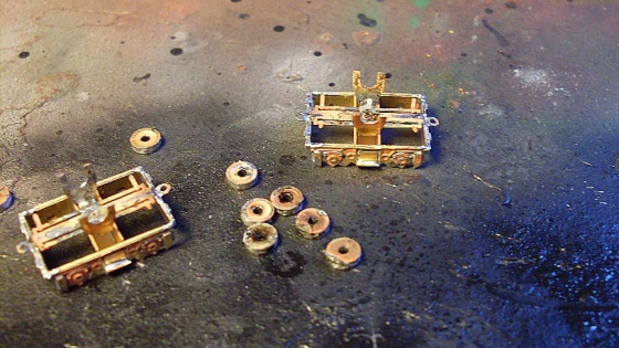 Na kolečka se u pana Šátka asi ani nemá cenu ptát, průměr pojezdové plochy kolečka je 3,2 mm a nedovedu si přdstavit jak vyrábí takhle velikou izolovanou nápravu… O použití Z dvojkolí jsem uvažoval, ale nikde jsem na ně nenarazil ani jako na náhradní díl. Možná by ani nešly použít, protože je tady dost specifická délka osičky od hrotu k hrotu a podobně. Tohle je prostě dvojkolí šité na míru přesně do podvalníku, nalezení přesně pasujícího továrního výrobku je asi nereálné. Zatím uvažuju o výrobě samotných koleček z nějakého plastu, aspoň to zaručí pravidelnost a nebude tolik práce se skládáním kol.
