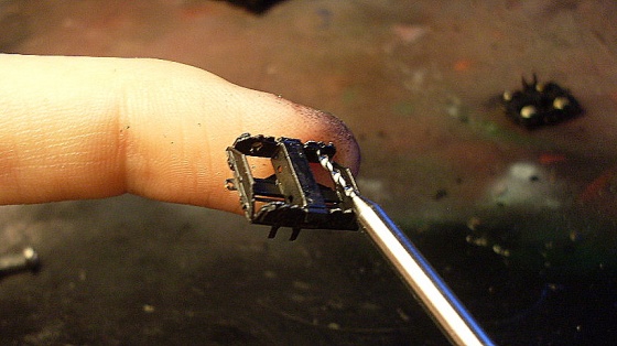 Následuje začištění důlků pro dvojkolí špičkou vrtáčku (mě se osvědčil průměr 1,1 mm) a už nezbývá než nacvaknout dvojkolí do rámu.