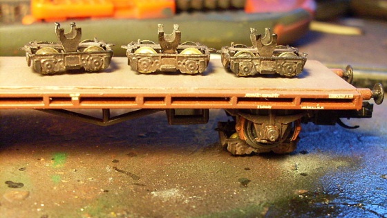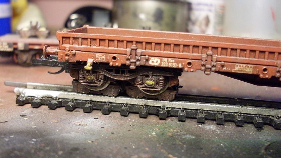 Zbývají už jenom testy „podvalníkovatelnosti“. Zde v akci vůz Pd. Je vidět, kam podvalník patří a jak na nápravě sedí. Tohle mi celkem vyšlo podle plánu, dokonce trochu místečka zbývá.