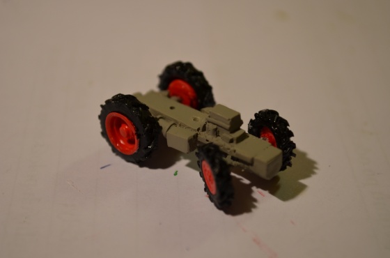 Pak jsem si díly odmastil v jarové vodě a opatřil je párátky pro snadnější manipulaci. Nejprve všechny díly kromě kabiny budou opatřeny základovkou. Rám s motorem a hydraulikou budou šedé stejně jako střecha, pneumatiky jsem načernil. Disky kol spolu s blatníky a kapotou motoru červenou Revel 34.