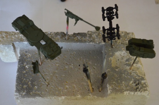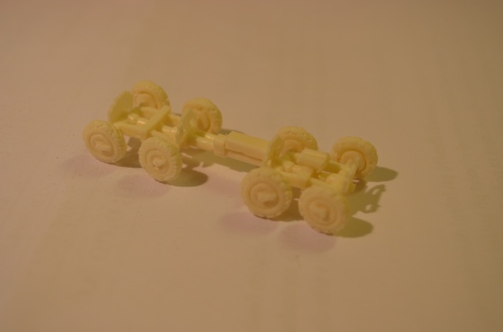 Nyní je vše připraveno na nástřik základovkou a potom zelenou mimo podvozkové části, ta je nastříkaná černou, rovněž tak kola.