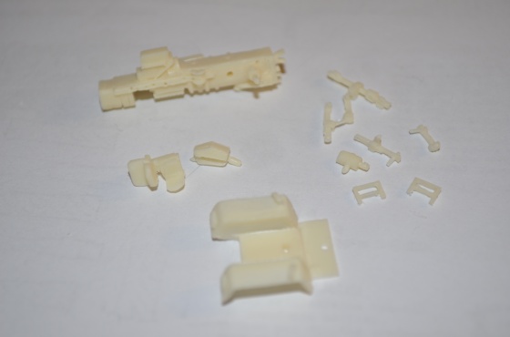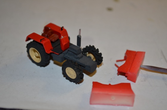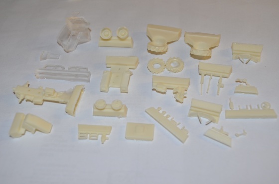 Vlastní stavbu jsem započal roztříděním jednotlivých dílů, kdy jsem si rozvrhl, kde zůstanou nálitky až stříkání a další, které začnu zpracovávat. Takže jsem si nálitky odstranil ze všech podvozkových dílů, tedy rámu s motorem, dílů hydrauliky, střechy, přední nápravy a také kabiny.