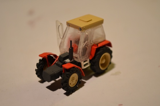 Skla kabiny jsem „zprůhlednil“ Opravným lakem od Agamy. Přitom jsem na přední a zadní sklo umístil stěrač. Dokončenou kabinu jsem přilepil na traktor. Dále jsem umístil přední kapotu motoru.