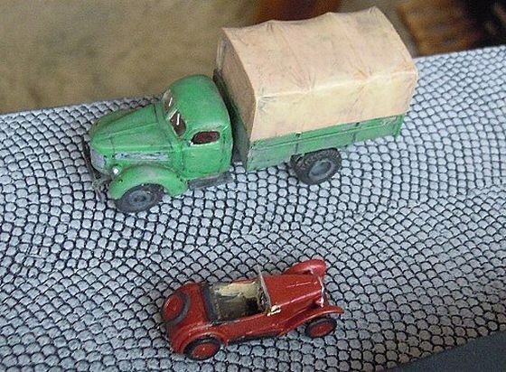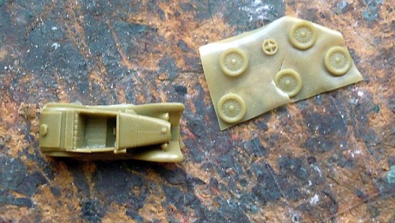 Miniaturní odlitky v bláně, plátek fólie a návod, to vše v miniaturním igelitovém pytlíčku. Po vybalení jsem přepočítal díly – korba vozu, pět kol, volant – sedm. Přední sklo je nutné vystříhnout z přiložené fólie – osm.