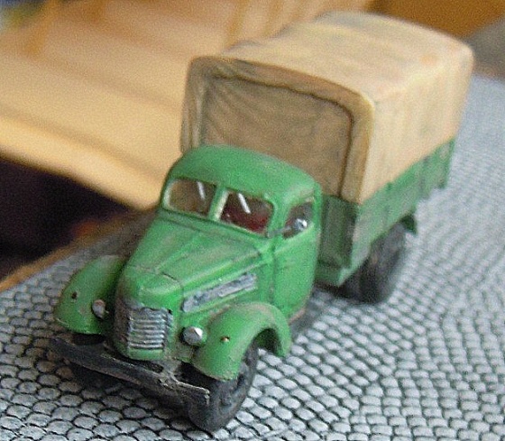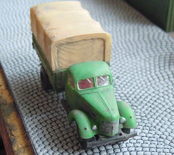 Nu což – lehce jsem ji zaškrábl a protáhl žebrování mřížky „turch“. Opravil jsem nátěry, doplnil patinu stroje tak, aby vypadal jako po dlouhé štrece a nakonec na korbu nalepil velmi pěkně napodobenou plachtu, jejíž záhyby jsem lehce zvýraznil prachovým patinátorem, naneseným na sucho.