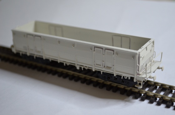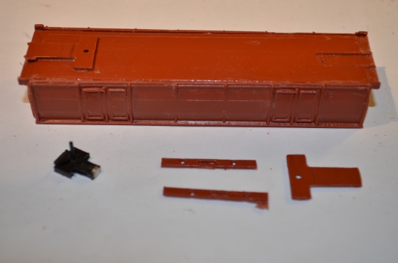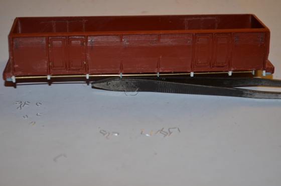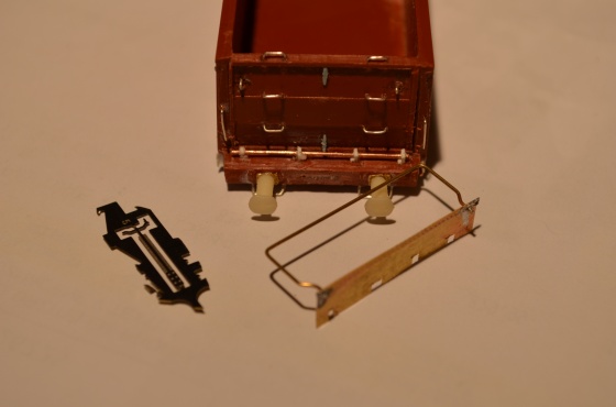 Z jednotlivých dílů jsem tedy sestavil korbu vozu, na spodní části podlahy jsem odbrousil nálitky pro kanál pružinky spřáhla a zkrátil podložky podvozků tak, aby se daly usadit kinematiky. A ještě jsem přilepil čelníky.