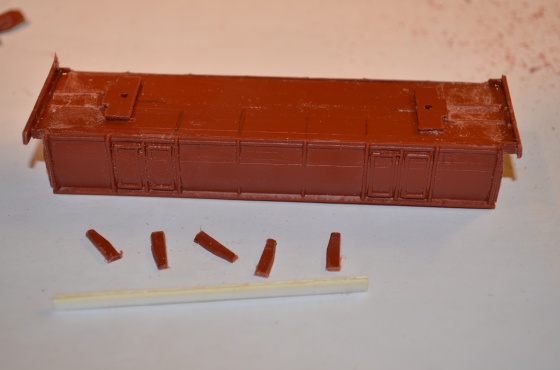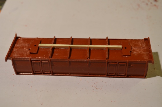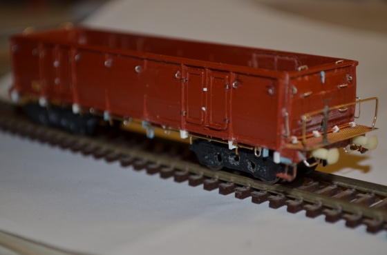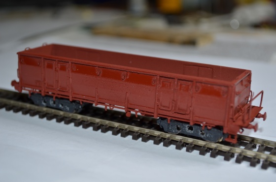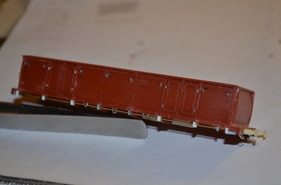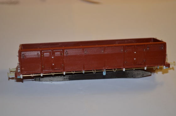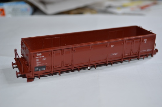 Nyní byl vůz připraven do lakovny. Základovka vše krásně sjednotila. Potom jsem vůz nastříkal červenohnědým odstínem Revell 37