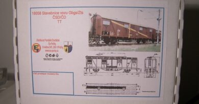 riči: tenhle vůz roztečí otočných čepů odpovídá na stavbu jeřábového vozu, ale já bych ho nepoužil, ta stavebnice je moc úzká, ty podvozky jsem musel dost zbrušovat, aby vůz byl schopen projíždět oblouky, raději bych použil lité bočnice od SDV (viz starší článek o jeho stavbě).