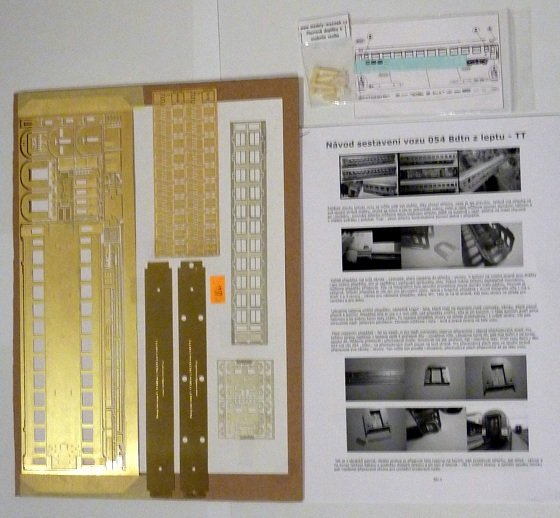Dostupné materiály u výrobce vypadaly zajímavě, a tak jsem si objednal dva kousky celoleptové stavebnice vozu 054 – Bdtn ve variantě „komplet“. V úhledném balení Vám přijde karton s leptem samotného vozu, okny, podvozky, rámem a sedačkami. Je přibalen i podrobný návod čítající 5 stránek.