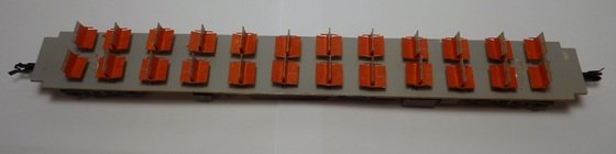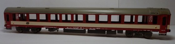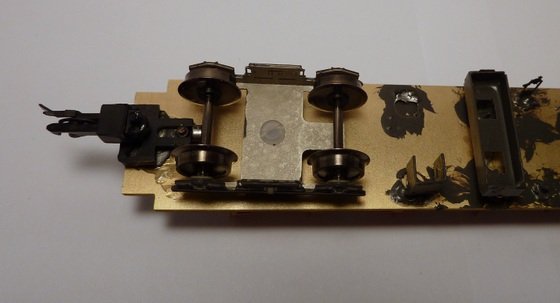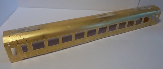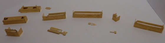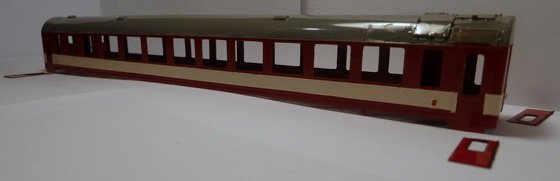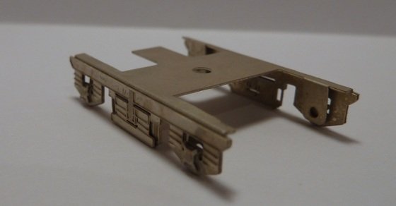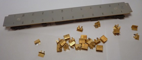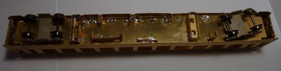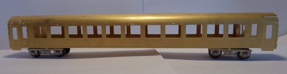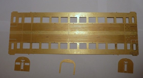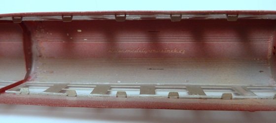 Tím máme skříň vozu komplet. Tak se pustíme do spodní výzbroje. Doporučuji si nyní na rámu pojezdu poznamenat, která strana je pod WC. Díly z leptu neoddělujte hned u krabic, ale nechte je včetně kusu leptu, ke kterému jsou přichyceny.