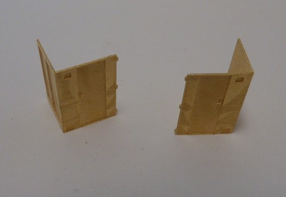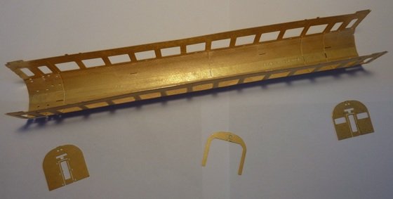 Nyní následuje vrchol celé stavby. Ohnutí rámu vozu. Bočnice a střecha jsou totiž jeden díl. Aby bylo tvarování jednodušší, jsou Vám k dispozici tři vnitřní přepážky pro kontroly tvaru. Když už jsem u těch přepážek. Uzavřená přepážky patří na konec, kde je děrovaná střecha a kam přijdou dekly. Tato má také zámečky pro stěny WC. Přepážka ve tvaru U je středová a přepážka s okýnky je na druhý konec vozu.
