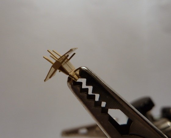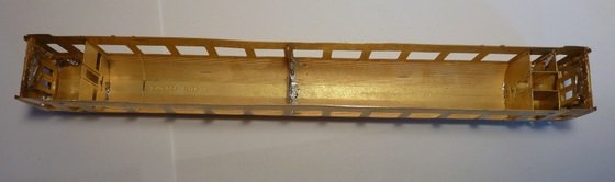 Přepážky mají ve střeše zámeček a po celé délce zářez, kam zapadnou. Střechu tedy ohýbáte a tvarujete tak dlouho, dokud nebudou přepážky u střechy celkem symetricky zapadat. Jakmile panuje spokojenost, stačí postupně od středu spájet střechu se středovou přepážkou a následně krajní vnitřní přepážky. K pájení jsem používal běžnou starou trafo-pájku.