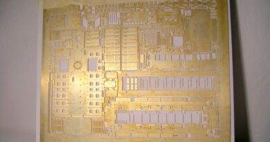 Doplňky: O funkci parního stroje mám jen mlhavou představu a kam vedou všechny trubky a táhla se můžu jen dohadovat. Na táhla a zábradlí jsem použil strunu 0,3 , na trubky měděný drát 0,5 a 0,6 a kabely ke světlům měděný drátek 0,2 mm. Je vhodné pro tyto doplňky navrtat kotel. Výrobce doporučuje vrtáček 0,5 mm. Vrtá se do měděné trubky se sílou stěny asi 1 mm, která tvoří vyztužení kotle. Dodal jsem vzdušník ze železné kulatiny instalovaný na dřevěných podstavcích a přepásaný měděnou folii. Dynamo z 3 mm plastové kulatiny a kompresor od Hekttora. Ten jsem z dvoustupňového předělal na jednostupňový. Obruba komínu je z rozklepaného olověného drátku 0,5 mm. Nástavba tendru je laserovaná dýha mořená. Uhlí je pravé. Píšťala, mazací lis a pojistné ventily jsou vytočené z mosazi. Ze zbytků leptu jsou vodovodní armatury, které sice nejsou moc věrné, ale měnit to už nebudu.