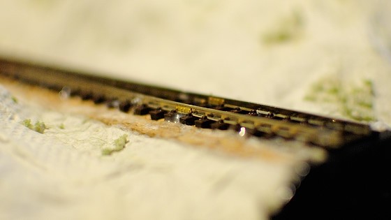 Když už jsem byl v tom hračičkování, zkusil jsem si nechat vyleptat i kolejové spojky, které jsem osadil poprvé právě na tyto modulky. Dílky mikroskopických rozměrů „tak akorát vystřelit z pinzety do světa“. Na jeden spoj patří 4 ks (ze dvou stran každé kolejnice), takže relativně piplačka, ale lepení probíhalo rychle. Lepil jsem je jen do kapky barvy s tím, že se při nátěru balakrylem samy zalepí.