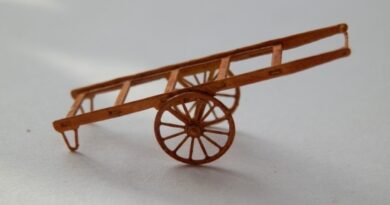 Po zaschnutí barev jsem kůlny postupně slepil disperzním lepidlem – nejprve jsem sestavil okna a spolu s dveřmi je vlepil do příslušných otvorů v čelní stěně, pak nalepil dýhové obložení podstřešní části. Zde se ukázalo, že výřezy pro kostru střechy jsou na vzájemně přiléhajících dílech poněkud „rozjeté“. Před barvením jsem souosost otvorů nekontroloval, takže to mohl být důsledek barvení. Každopádně jsem otvory zarovnal nožem, aby kostra střechy zapadla na své místo. Na dveře kůlny v H0 jsem ještě doplnil kliky a štítky zámků. Následně jsem sestavil obvodové stěny (mají v rozích drobné zámky) a nalepil je na obvod podlahy (návod to doporučuje až jako poslední úkon). Výrazně to pomůže udržet geometrii stavby. Dále jsem nalepil kostru střechy – je kvalitně laserovaná jako jeden kus. Následovalo nalepení krytiny na kostru. Tím bylo po stavební stránce hotovo. Po proschnutí jsem barvou zaretušoval světlá místa a stopy po laserování a lehce přetáhl celé stavby „špinavým lakem“.