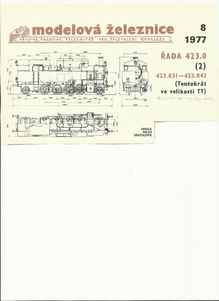 První návod na lokomotivu 423.0 je z časopisu Železničář ročník 76, poslední stránka z roku 1977.