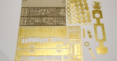 Bočnice naohýbat jako vždy pod lehkým úhlem. V mosazném stavu jsou fotky ze stavby verze B951 (bez E), tedy ještě se skly v gumách, jinak uspořádané okenní příčky a jiná přední maska, ale stavebnice je již připravena na verzi E se skly lepenými.