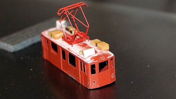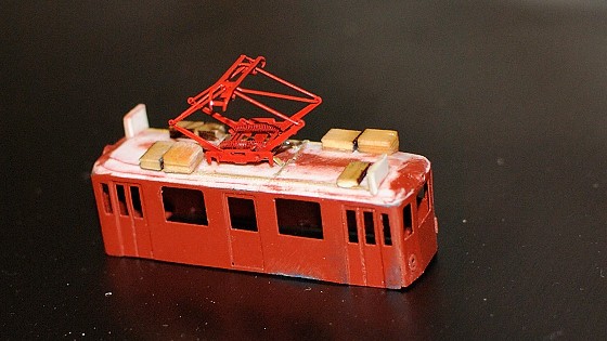 Pantograf Sommerfeldt byl doplněný o leptanou „kánoi“ jako kryt originální pružiny. Povedlo se docela dobře trefit odstín. Problém krytu je, že na pantografu moc nedrží, protože přisedací plocha je malá a při zvdihu pantografu se dotýkající se části mohou pohybovat a kryt tak vytlačit. Příště budu muset řešit nějakým přichycením ke střeše, a nad pantografem se bude asi „vznášet“.