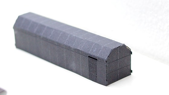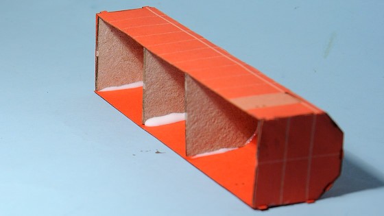 Sestavení je jednoduché, stačí hlavní díl naohýbat podle vygravírovaných drážek, zpevnit příčkami a na čelní příčky nalepit pohledovou vrstvu čela.