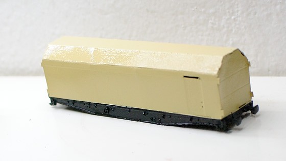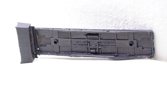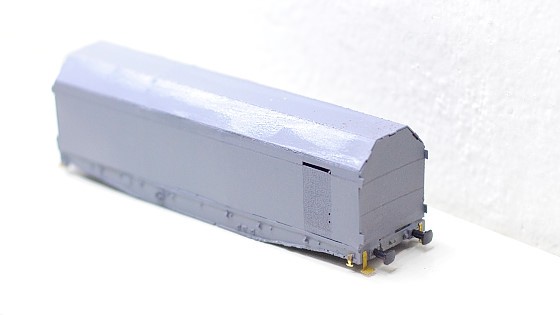 Spodek vozu jsem začistil, nalepil na něj nástavbu (pasuje téměř přesně) vteřinovým lepidlem, všechny místa spojů ještě prolil, a stříknul základovkou, abych se podíval, kde bude potřeba tmelit. Šlo to dobře a rychle, a tak jsem hned osadil i leptané stupačky a jednu uraženou kotvičku.