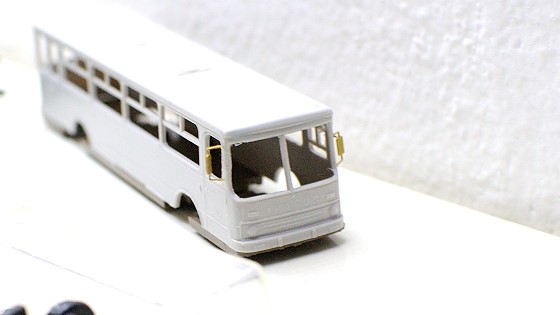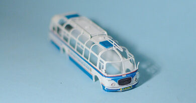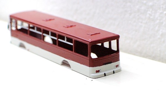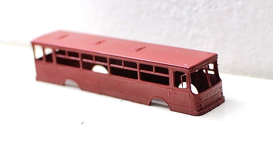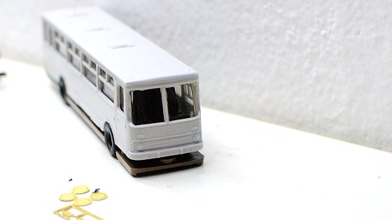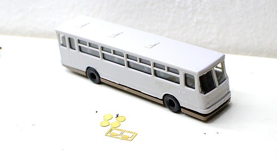 Pak začne ta nejdůležitější fáze – pomocí drobností z toho utvořit něco, co se jednak podobá Ikarusu a jednak to posune model nad úroveň „hnus fialovej z moře vytaženej“. Natřít zrcátka, světla (jde to skutečně špatně), černý nárazník podle skutečné fotky je volitelný, jsou i bílé, nebo jsou masky dvousvětelné (pozdější verze).