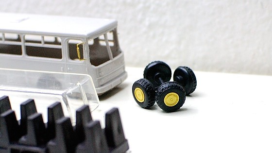 Na kola jsem osadil poklice. Kola byla v průběhu let co dům a východní ekonomiky daly. Začalo to Trilexy (věřím, že spousta jich jezdí dodnes, dokud se někde v Uzbekistánu doslova nerozpadnou), pokračovalo to ráfky podobnými těm u Karos. Výjimkou nebude různý mix. Tedy modelovat konkrétní provedení snad jen podle konkrétních fotek (ideálně z výroby). Ovšem, takové Ikarusy na Trilexech v modelu nemusí vypadat špatně.