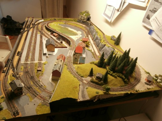 Na rozměry 98 x 176 cm se toho díky vlemi utaženým BTTB obloukům vešlo dost. S funkčností to bylo slabší. Nedořešené řízení výhybek jak pomocí serv, tak pomocí elektromagnetických přestaníků, nerovné podloží,… Naopak překvapila funkčnost nejstarších výhybek, u kterých jsem nahradil původní plechové kolejnice za profilové. Ty vykazovaly menší poruchovost než některé stavebnicové z produkce Tilligu – ale o tom někdy příště. Prostě, dalo se na tom jezdit, jen jsem stále toužil po dokonalejším kolejišti, které již z tohoto „mutanta“ nemohlo vzniknout. Byl čas na změnu.