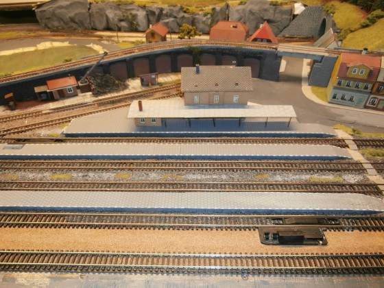 Ještě s odstupem se k tomu vrátím – souhlasím, že ten angličan na zhlaví by byl lepší vynechat – je to dost „nevšední“ řešení odjezdu na dvě tratě. Spíš nemusí být možnost jet z kterékoliv koleje na kteroukoliv trať, to je relativně běžné. Dál – vynechat tu mezeru mezi 1. a 2. kolejí a nacpat tam ještě kolej navíc (úzká nástupiště nejsou nic neobvyklého ani na větších nádražích). Co tu slepou trať napojit do nádraží z druhé strany, vystoupat 1 patro tobogánem, pak odkrýt půlku oblouku a napojit do stávajícího stavu? Tak nebude muset být vmáčnutá kolej za rotundu. Navíc teď tam vlastně není možnost jak se dostat k nádraží „po silnici“ – nádraží je odříznuté v úzkém proužku země. Do slepého přídavného modulu se dají ve skryťáku přidat nějaké kusé koleje na „odcouvání“ některých vlaků (sám vidím, že vlaků je časem víc než kolejí).