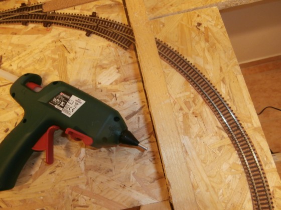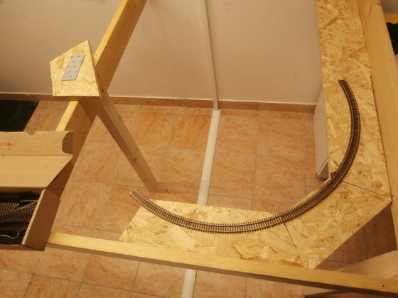 Až náhodně „pohozený“ oblouk mi vnukl myšlenku na jeden závit spirály s jednou výhybkou, která by vyřešila můj problém. Délka levého klesání by se tím prodloužila z jednoho na necelé tři metry, čímž by klesání/stoupání bylo jen 23‰ a to je už snesitelné. Přestavba nebyla nijak složitá. Ze zbytku překližky stačilo vyříznout příslušný oblouk a ten hladce napojit na současné klesání. Chtělo to jen trochu vyměřování a řezání. Podkladové špalíčky jsem šrouboval malými vruty ke spodní OSB desce a klesání z překližky k nim z vrchu lepil horkým lepidlem. Překvapivě toto spojení drží neuvěřitelně pevně.