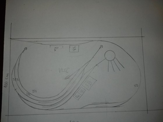 Jednoduše slepené listy papíru jsem vystříhal na šířky pásu, který povede pod kolejí a následně překreslil na desku. Nutné taky bylo rozvrhnout umístění točny v pravé části nádraží, zda se vše vejde. Točnu plánuji s o něco menším průměrem, takže místa okolo bude nakonec dost.