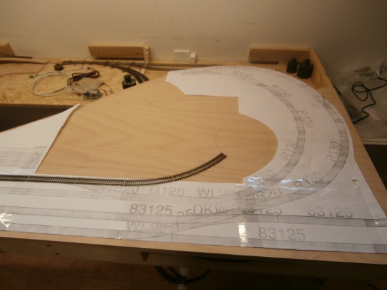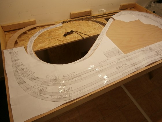 Potom už se mohlo spodní patro překrýt. zde také došlo ke konstrukční změně. Příliš tlustou a tuhou OSB desku nahradila pouze pět milimetrů tenká překližka. Hlavním důvodem bylo jednodušší zpracování stoupání/klesání do skryté vratné smyčky. Hladké přechody do sklonu zajistí bezproblémový provoz prostý rozpojování vozů, zachytávání spřáhel a vypadávání na zlomech. Abych dodržel geometrii bylo načase vytisknout z WinTracku nádraží s klesáními v měřítku 1:1. Byť to sežere hromadu papíru, tak je to, dle mě, nejlepší způsob jak se vyhnout problémům s geometrií oblouků.