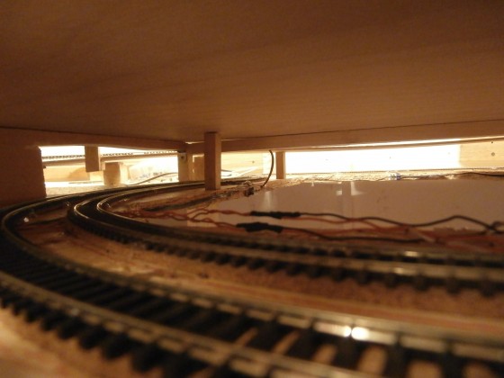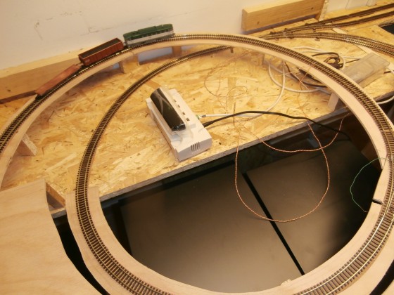 Během odpoledne byl oblouk usazen a korek přilepen. Stačilo už jen položit koleje a rozvrhnout elektrické zapojení. Rozhodl jsem se zde přidat další dva ABC moduly ve směru dolů před výhybku ve spirále. Boudou mít funkci vjezdových návěstidel do skryťáku. V budoucnu bych chtěl ovládání těchto ABC úseků logicky propojit se snímači obsazenosti ve smyčce. Pokud bude plná automaticky se nastaví na „stůj“ a vlak nebude mít možnost vjet do smyčky, dokud se neuvolní místo. Jednalo by se o poslední úroveň ochrany proti srážce. To je však prozatím hudba budoucnosti. Úsek mezi výhybkou ve spirále a první výhybkou ve smyčce je jako jediný napájený přímo signálem J-K z centrály, zbytek kolejiště je v podstatě ve vratné smyčce, napájené přes smyčkové moduly.