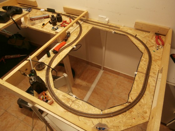 Nakonec z osmi dílů vznikl prostor pro dvojkolejnou vratnou smyčku, centrálu a hromadu elektronických modulů. Po truhlařině přichází na řadu vybalení kolejí s pár vozy a ověření průjezdného profilu. Nastala chvíle pravdy, zda CADy nelžou a vše bude pasovat jak má.