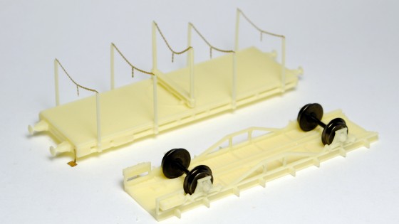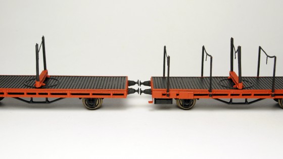 Řetízky jsou milý detail. Jen je potřeba s modelem zacházet opatrně, lité klanice jsou křehké a neradno jejich odolnost pokoušet. Ve stavebnici najdete dvě navíc, ale stejně nedoporučuji nic riskovat. Kdo už dopředu tuší, že jeho vagonek dostane v provozu zabrat, tomu bych asi doporučil náhradu klanic silnějšími zhotovenými z mosazných profilů nebo Evergreenu, který je o něco houževnatější než odlitek… Oplen má na spodní části kolík, který zapadá do otvoru v podlaze. Je tak možné to celé slepit, nebo nechat oplen otočný. Já to zatím nechal otočné, ale spojení nevede příliš do hloubky a tak oplen občas vypadne. Pokud by chtěl někdo modelovat naloženou dvojici vozů, nejspíš by bylo lepší celý vůz provrtat skrz a oplen přichytit pomocí malého šroubku.