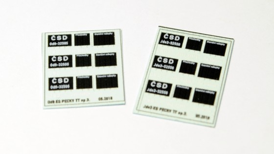 Obtisky ke stavebnici nejsou zrovna komplikované. Nápisů je jenom pár, většinou jsou to jen popisové tabule na bočnicích. Tisk bílé je trochu rozpitý, ale vzhledem k drobnosti písmen to na hotovém modelu moc rušivě nepůsobí. Sady obsahují vždy jen jedno provozní číslo, zase je tu ale všechno 3x, takže máte možnost něco zkazit. Každý motiv je potřeba zvlášť vystřihnout, vše je na jednom laku.